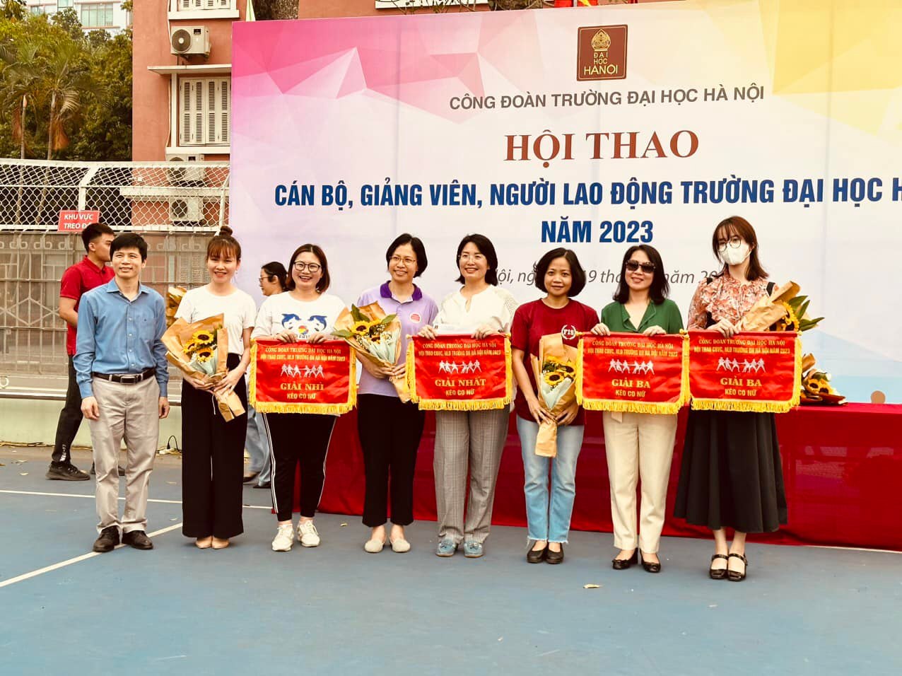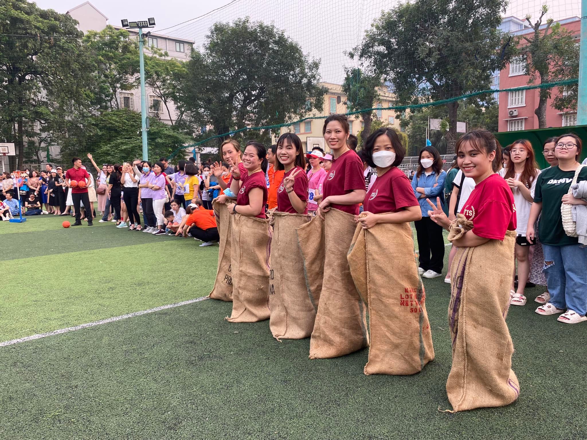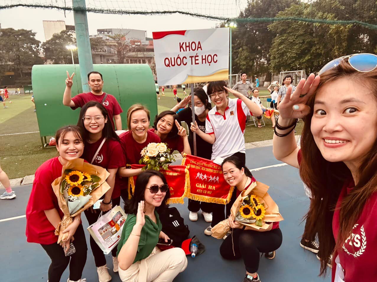 Chào mừng và chúc mừng các cán bộ, giảng viên khoa Quốc tế học đã đạt giải cao tại Hội thao 2023 của HANU. Nối tiếp chiến thắng kéo co, hôm nay đoàn chúng ta thi đấu bản lĩnh, thành công, giành giải cao tại cuộc thi Kéo co nữ và Nhảy bao bố của Hội thi này.