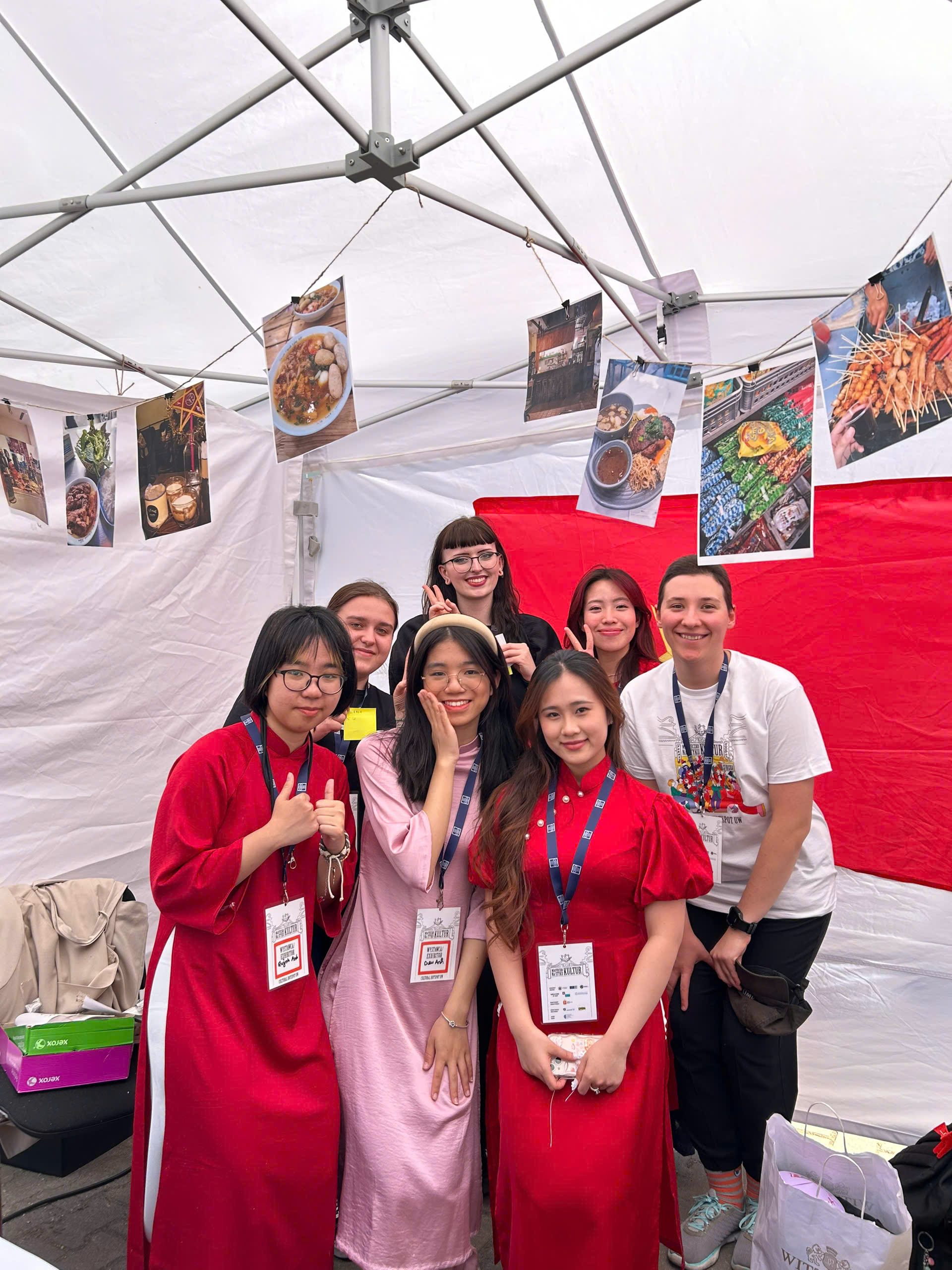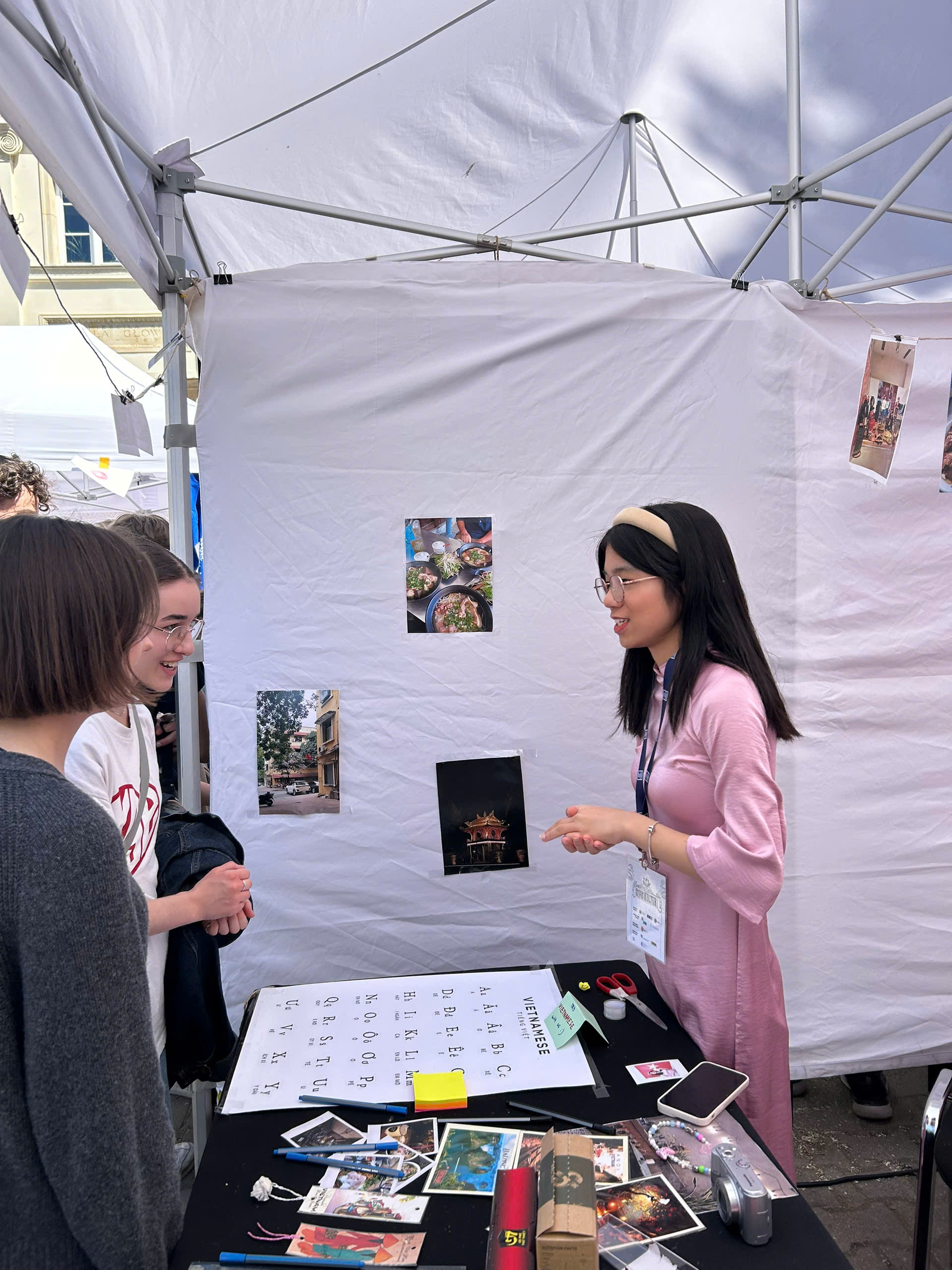 Trong hành trình ấy, mình tự hào giới thiệu văn hóa Việt Nam đến bạn bè quốc tế, biến ước mơ quảng bá quê hương thành hiện thực đầy ý nghĩa. Cảm giác tự hào dâng trào khi trực tiếp dạy bảng chữ cái tiếng Việt cho bạn bè quốc tế, lắng nghe những âm thanh bập bẹ nhưng đầy ấm áp giữa lòng châu Âu. Không chỉ dừng lại ở việc giới thiệu, không gian này còn là nơi giao lưu đa sắc tộc khi sinh viên Việt Nam được khoác lên mình trang phục Nhật Bản, thưởng thức bánh kẹo Ấn Độ hay tham gia trò chơi ngôn ngữ của các bạn Tây Ban Nha. Những kỷ niệm đáng nhớ này đã biến niềm vui cá nhân thành lòng tự hào dân tộc sâu sắc, khẳng định giá trị của việc hòa nhập nhưng không hòa tan trong môi trường quốc tế. Gian hàng nhỏ bé ấy chính là lời mời gọi chân thành nhất, thôi thúc bạn bè quốc tế tìm đến khám phá vẻ đẹp trọn vẹn của đất nước hình chữ S trong tương lai.