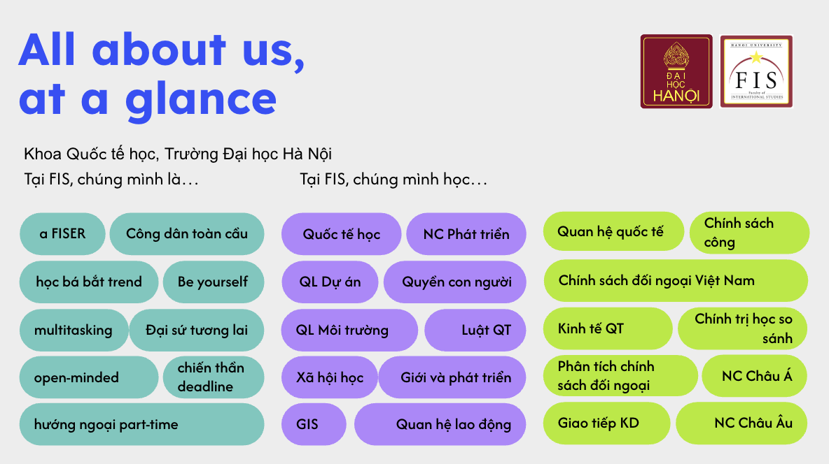 Khi lên chuyên ngành, các bạn được “upgrade” bằng cách chọn 1 trong 4 định hướng Quan hệ Quốc tế, Kinh tế Quốc tế, Nghiên cứu Phát triển và Chính sách Công. Với chương trình đào tạo 100% bằng tiếng Anh, mạng lưới đối tác rộng khắp từ Ý, Ba Lan đến Anh, Thụy Điển, FIS chính là chiếc “Passport” quyền lực nhất để bạn tự tin flex trình độ và bước ra thế giới. Đừng bỏ lỡ cơ hội gia nhập cộng đồng FISERS – nơi hội tụ của những chiến thần ngoại giao và những trái tim tử tế vì sự phát triển bền vững!